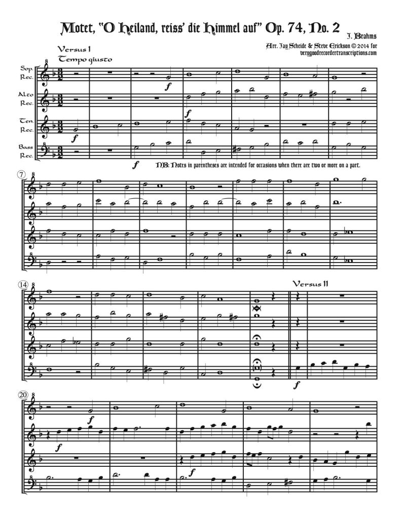 1. Brahms Motet, “O Heiland, reiss‘ die Himmel auf,” (O Savior, Open the Heavenly Gates,” Op. 74 No. 2 transposed up a step to g dorian for SATB recorders. 2. The last section, “Et vitam venturi,” from the Credo of Beethoven's Missa Solemnis Op. 123, for SATB recorders. 3. The 1st movement, “Ave Maria,” from Verdi's Four Sacred Pieces for SATB. 4. An abridged version of the 4th and final movement, “Te Deum”, from Four Sacred Pieces for SATB recorders with Soprano recorder doubling Sopranino and Alto doubling Soprano. 5. The same Brahms Motet, this time at original pitch of f dorian. Five scores and four parts.