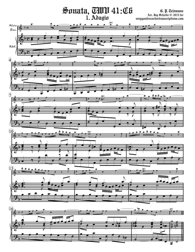 Originally for violin and continuo in C major, transposed to F in this arrangement. Four movements, Adagio, Allegro, Adagio and Vivace.