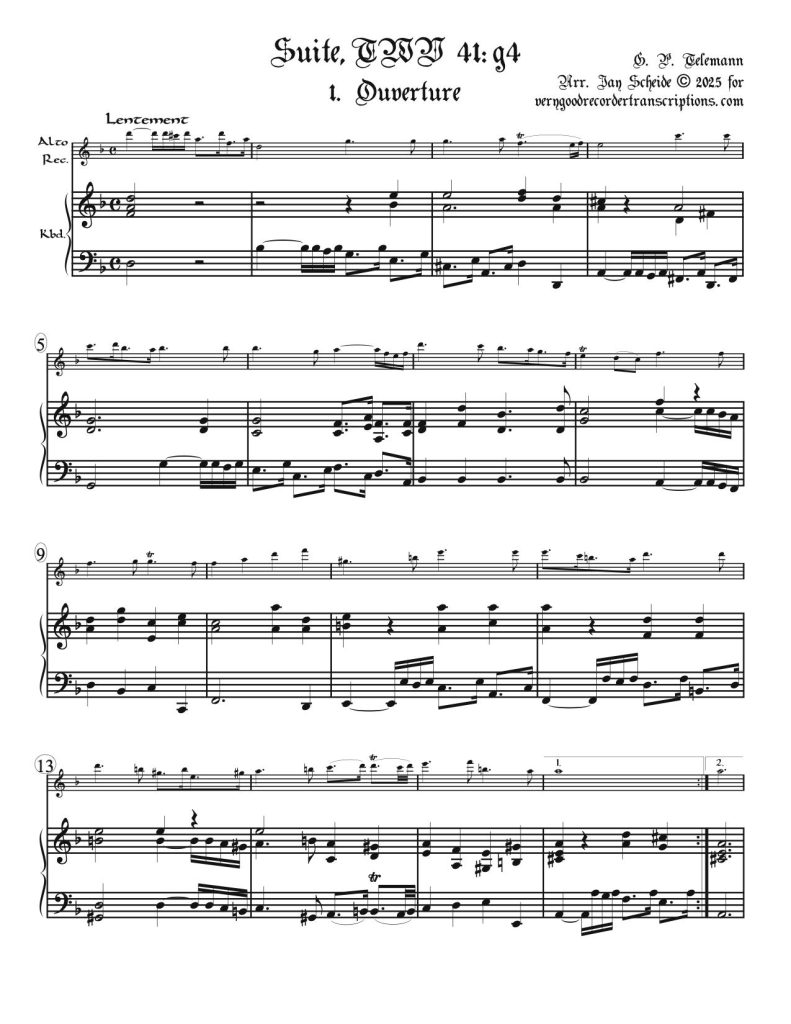Originally for violin or oboe & continuo in g minor, transposed to d in this arrangement. Seven movements: 1. Ouverture, 2. Très vite, 3. Sans Souci, 4. Hornpipe, 5. Gavotte, 6. Passepied, 7. Irlandoise.